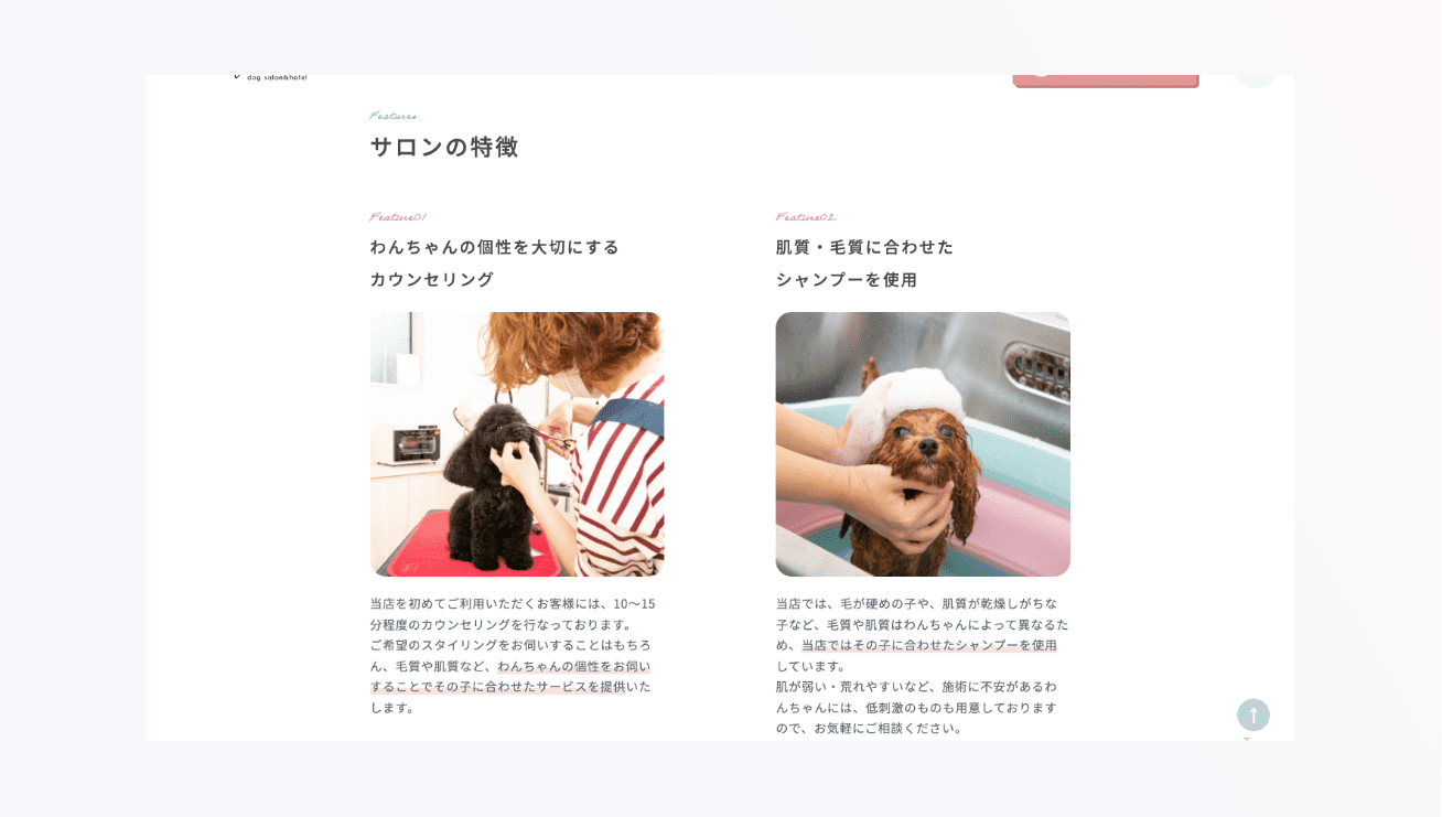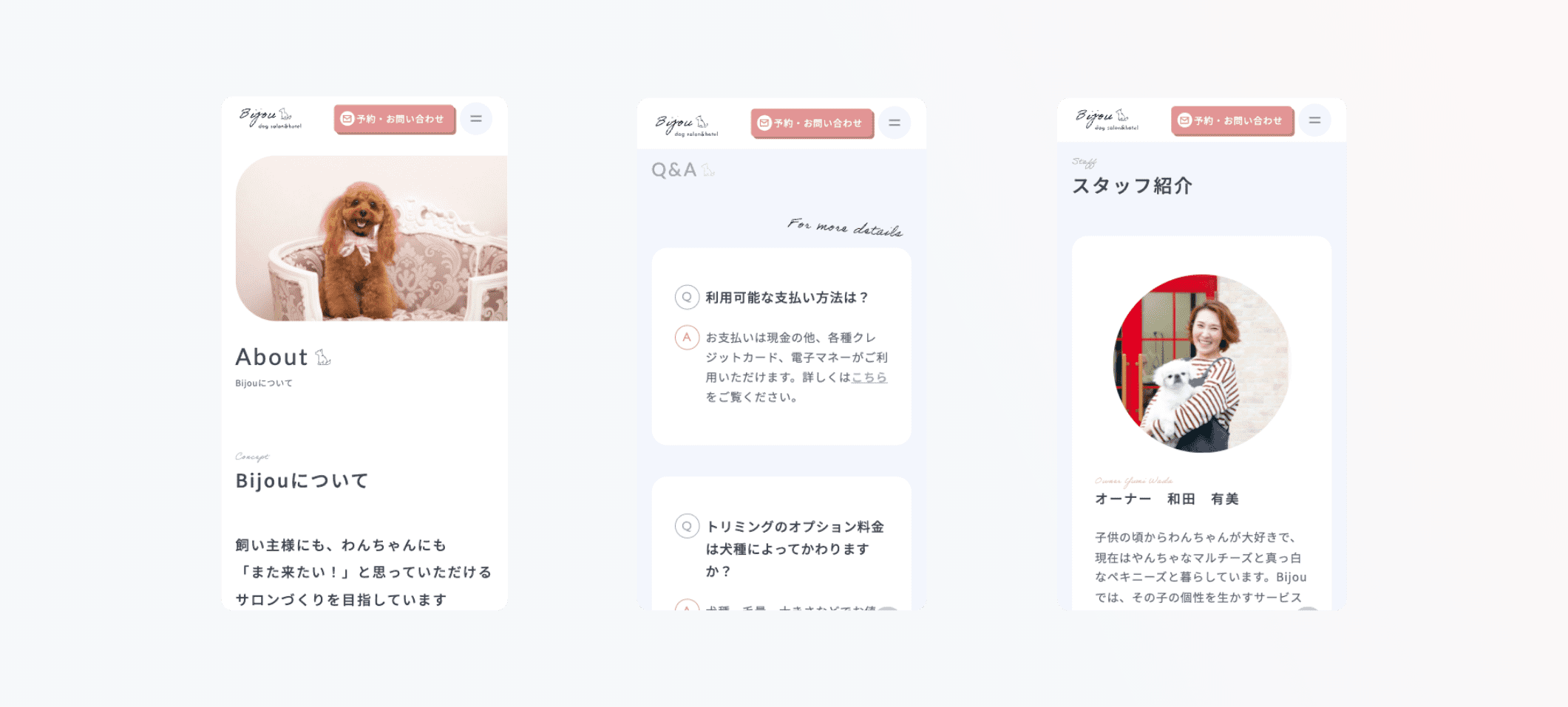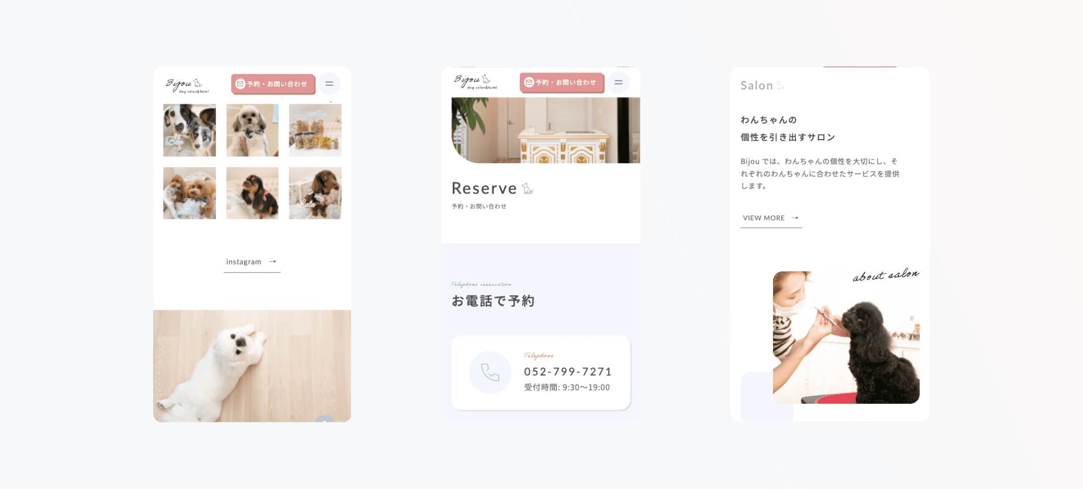 わんちゃん専用サロン・ホテルを運営するBijou dog salon & hotel様のショップサイト制作にてコーディングを担当しました。少人数のスタッフさんで営業されている店舗のため、Web上で24時間サロン・ホテルの予約申込みを受け付けられる機能を付けています。