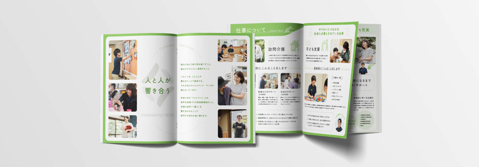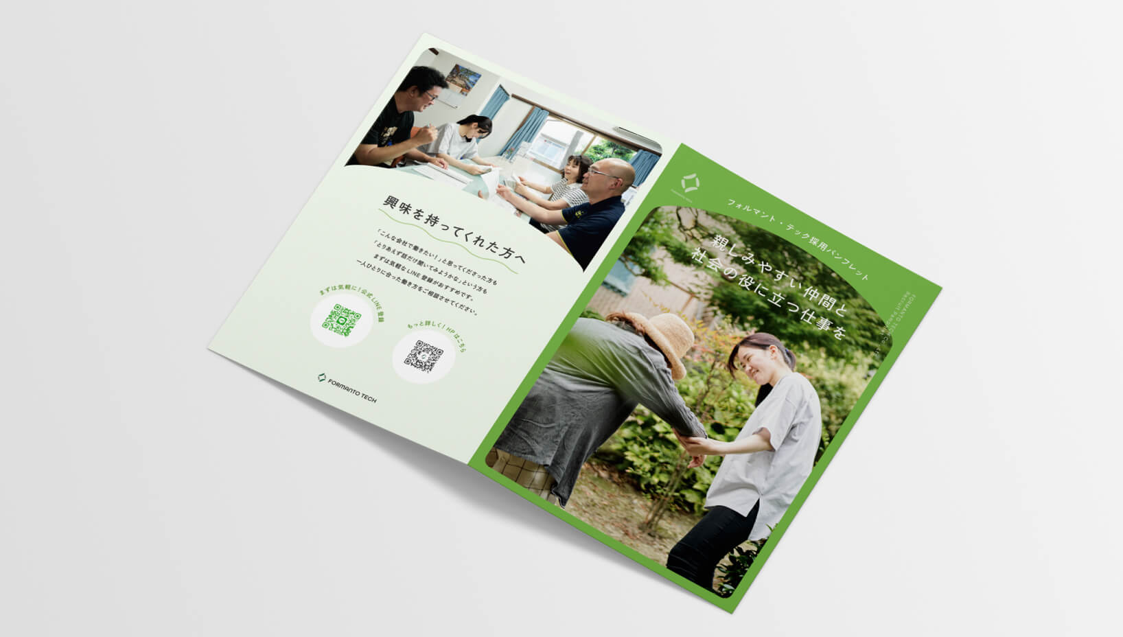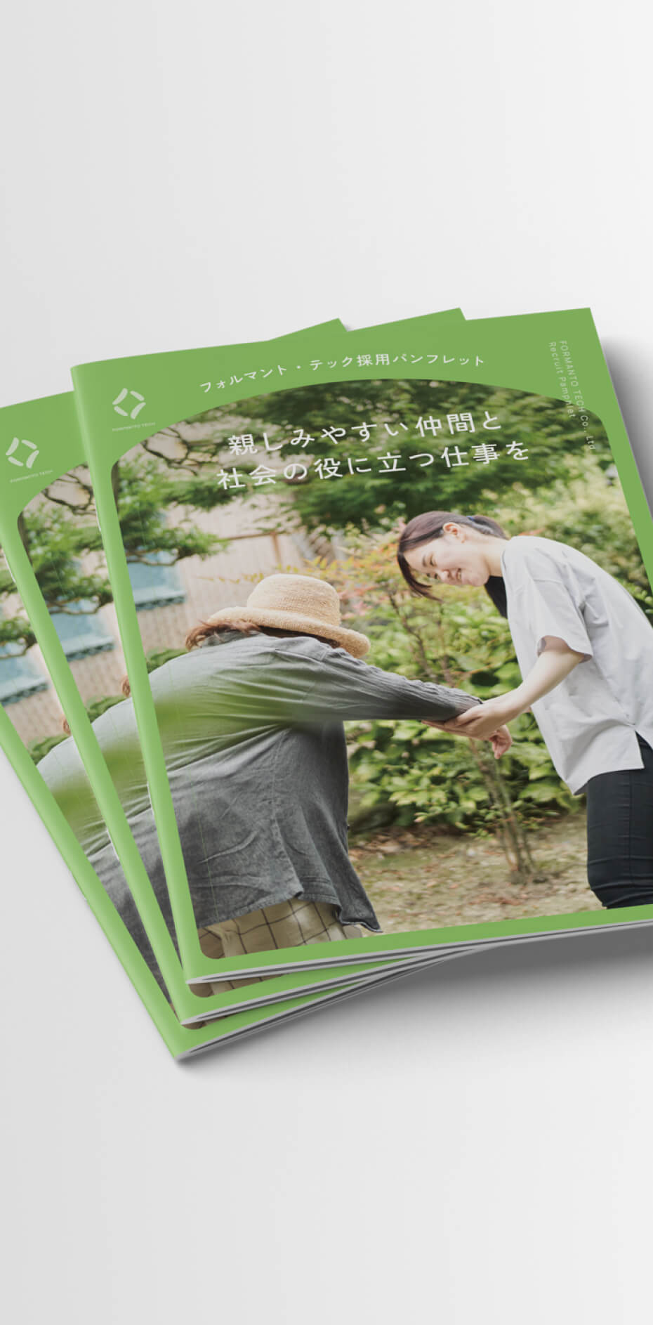 有限会社フォルマント・テック様の採用パンフレット制作にて、企画からデザインまで担当させていただきました。またディレクションも一部担当しており、写真撮影のプロデュースや社員インタビューなども行なっています。