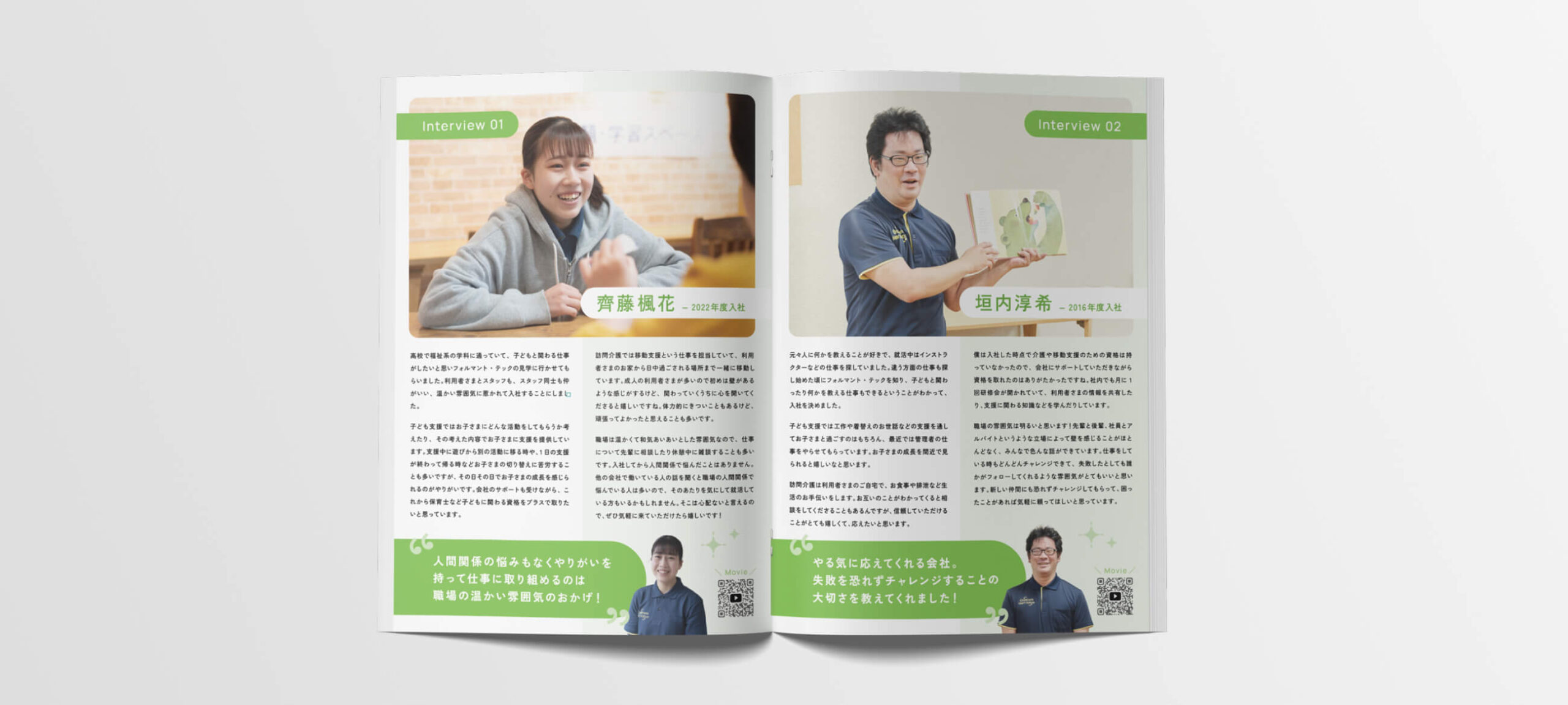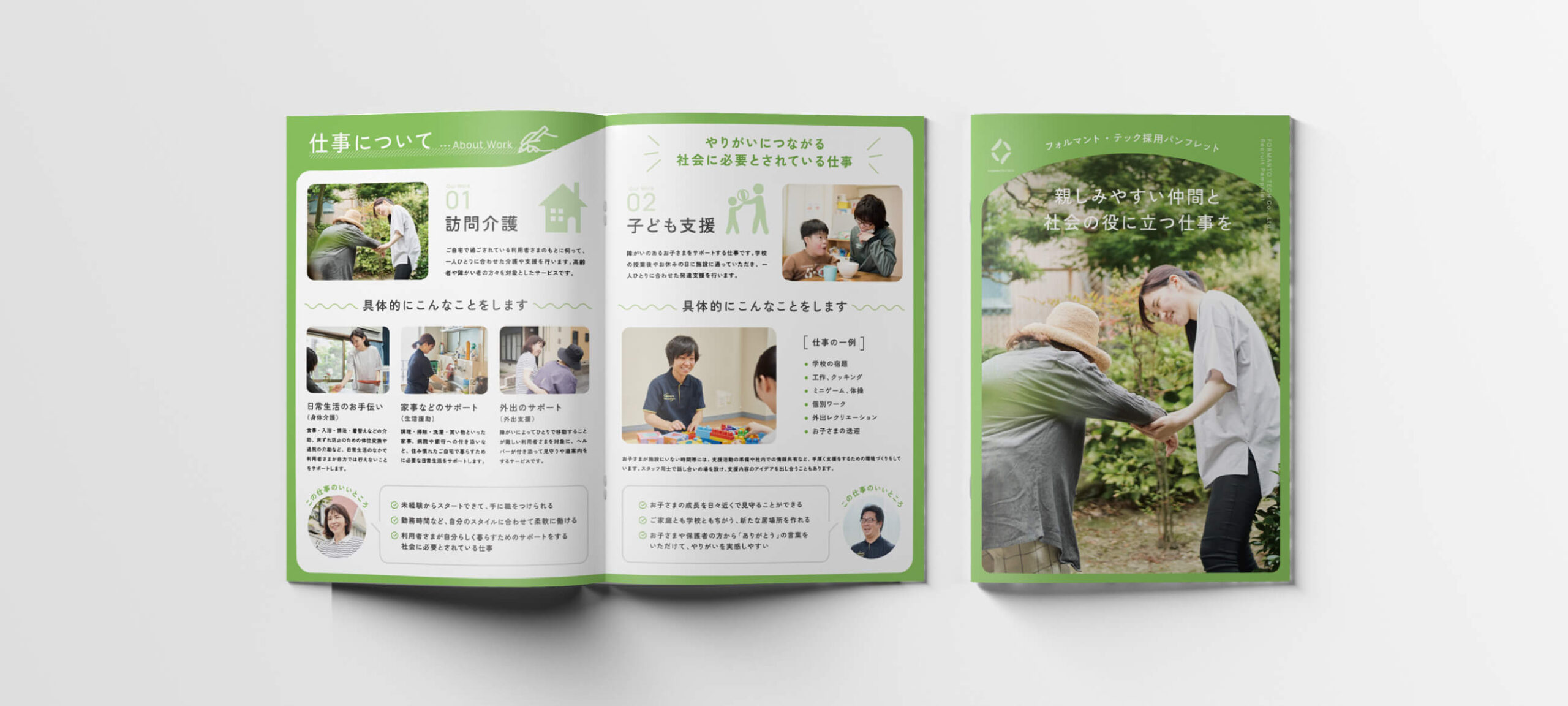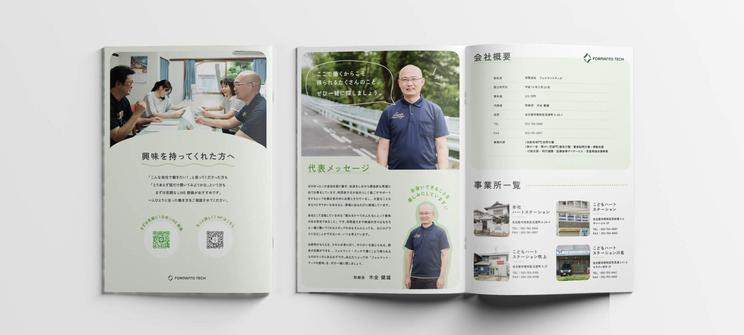 有限会社フォルマント・テック様の採用パンフレット制作にて、企画からデザインまで担当させていただきました。またディレクションも一部担当しており、写真撮影のプロデュースや社員インタビューなども行なっています。