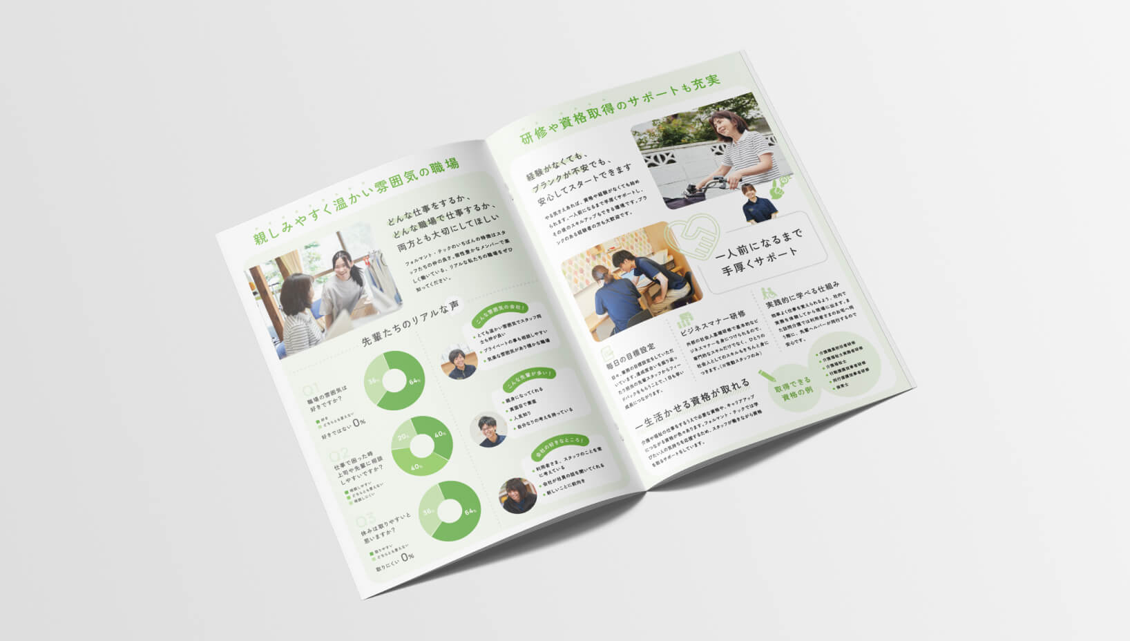 同時にご依頼いただいた採用サイトとセットでご活用いただき、若い求職者をターゲットに職場の雰囲気の良さを訴求できるよう制作しています。ビジュアル面では採用サイトとの一貫性を意識しつつ、Webデザインではできないような遊び心を散りばめてフレンドリーな社風を表現しました。求職者の方が手にとった時にワクワクしたり、求職者ご本人や親御さんなどに安心してもらえるようなパンフレットに仕上げています。
