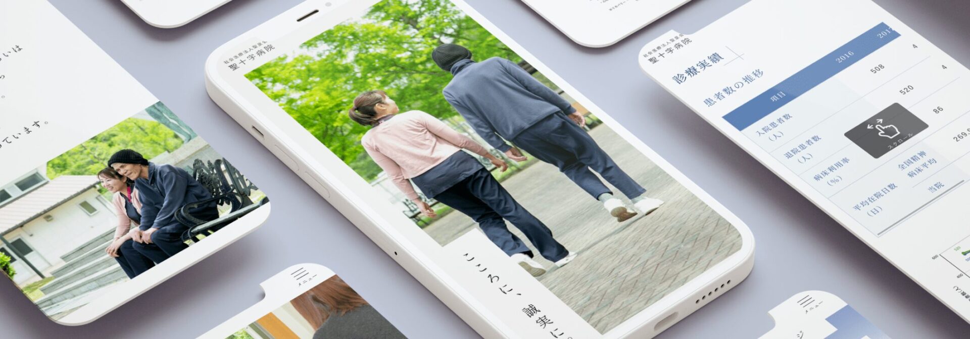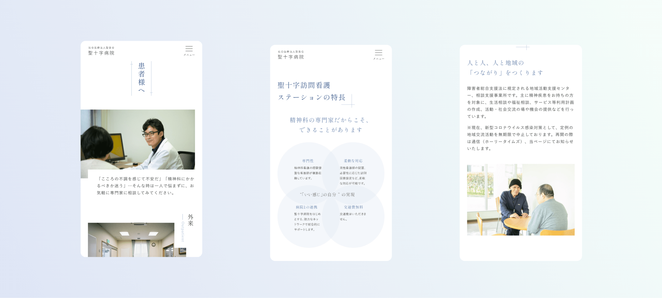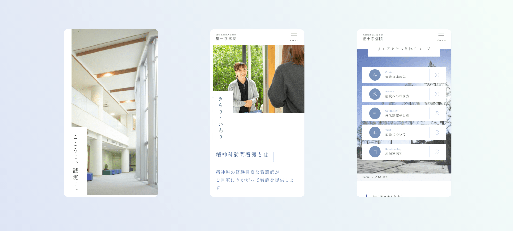 岐阜県土岐市にある心療内科・精神科の聖十字病院様の病院サイトリニューアルにて、デザインとコーディングを担当させていただきました。患者様・ご家族に安心していただけるよう柔らかいブルーと白を用い、病院の清潔感や、優しく落ち着いて信頼できる印象のデザインにまとめました。
