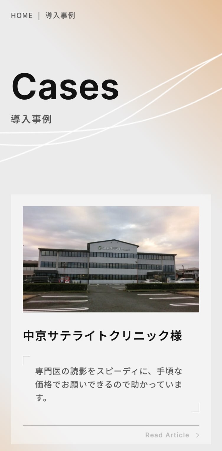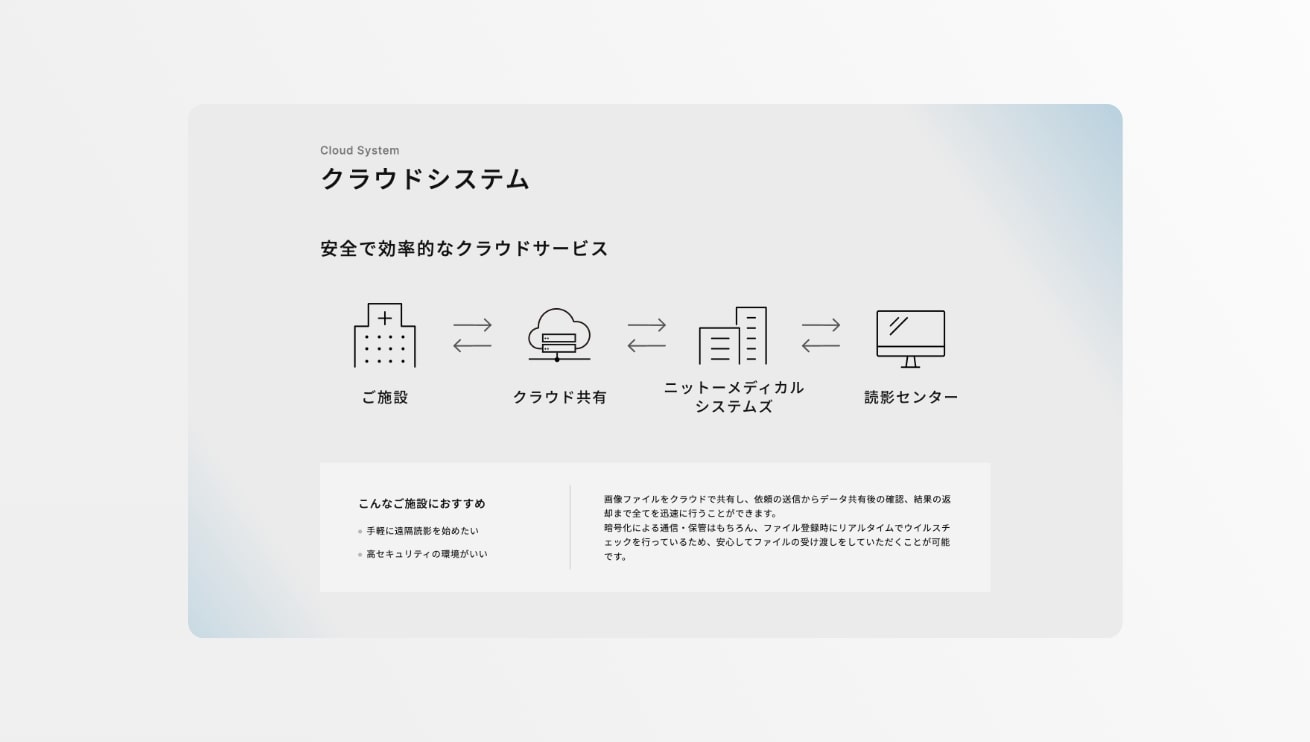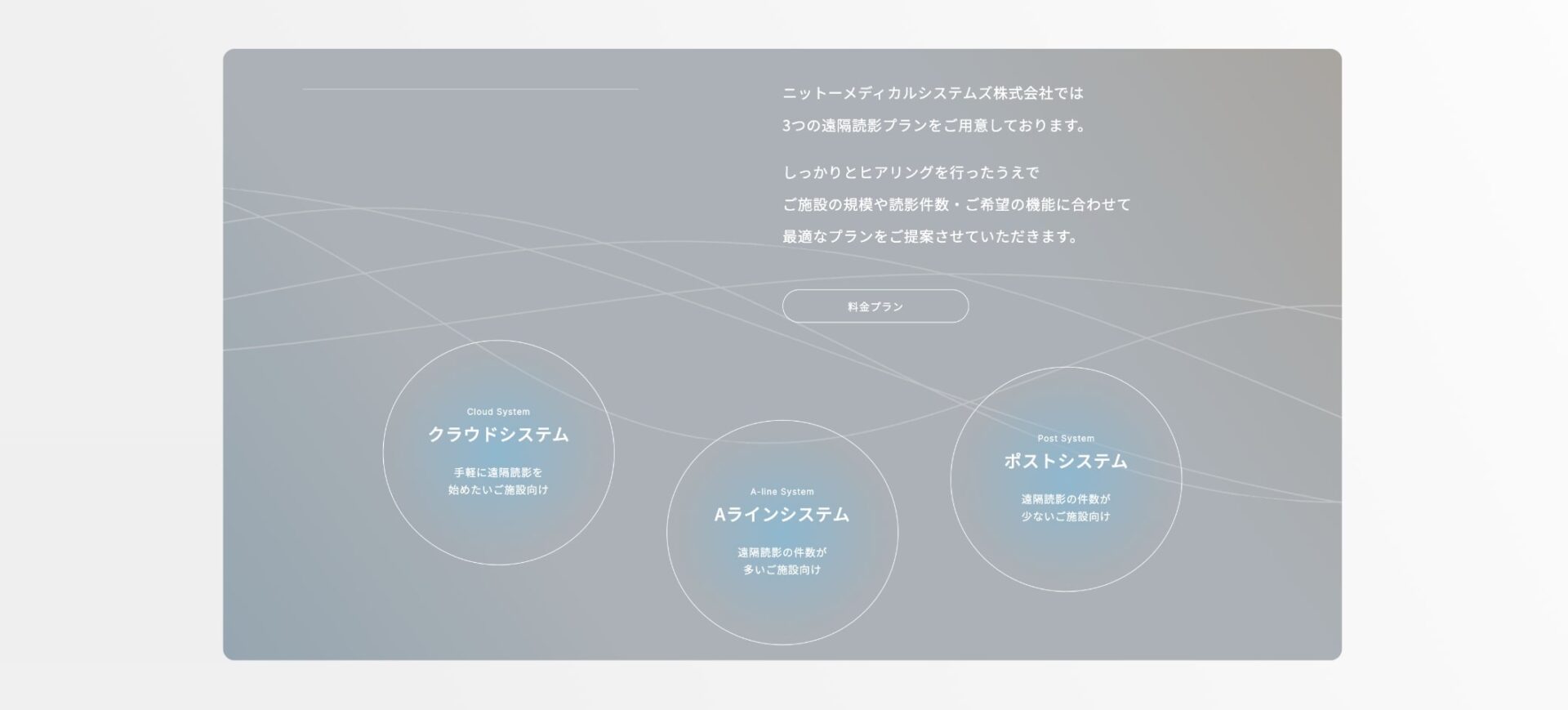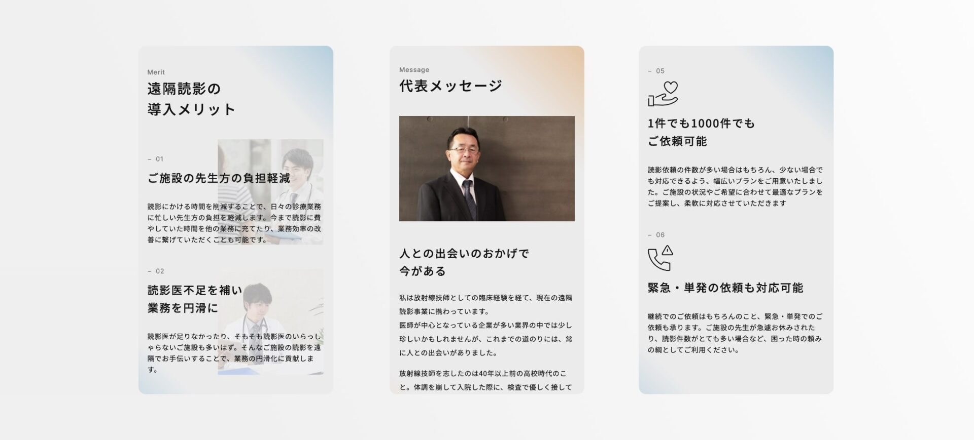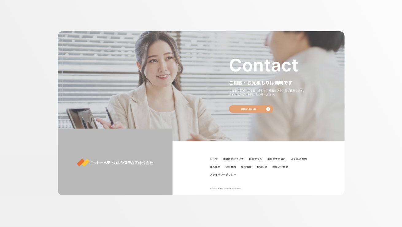 遠隔読影サービスを提供されている企業のため、患者様の情報を預かるうえでの誠実さや技術力を伝える必要がありました。そのため必要以上に装飾せず、モノトーンをベースにすることでかっちりとまとめています。一方で「困ったときのニットーメディカル」といった柔軟性や温かみを表現できるよう、やわらかいグラデーションやオレンジのアクセントを取り入れました。