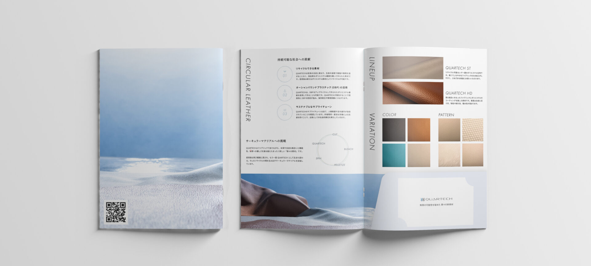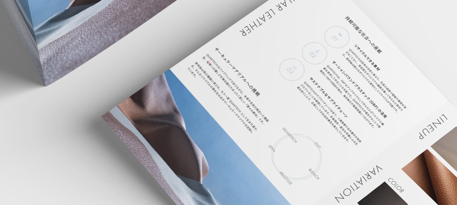 環境に優しく、まるで革のような新しい繊維素材「QUARTECH」のブランドパンフレット制作にて、情報設計・ライティング・デザイン・撮影ディレクションを担当させていただきました。
